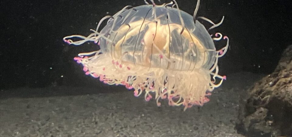 傘縁には数百本の棍棒状の触手と10数本の長い触手の2種類があります。泳いでいないとなかなか見られない長い触手が見られたらラッキー!