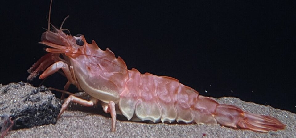 北海道羅臼町で発見され、2016年9月に新種として公表されました(千葉県立中央博物館、駒井智幸博士との共同研究)。エビジャコ科は、世界で約220種知られていますが、本種は世界最大で体長は25cmにも達することから、学名(種小名)には、王様を意味する「rex」とつけられました。生息水深は600-1000mと深く、生態は謎に包まれている一方、地元では、「ガサエビ」と呼ばれ美味なエビとして親しまれている種類です。