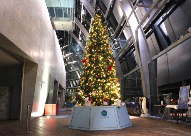 シーラカンスのぬいぐるみを中心に深い海にくらす生きものやシーラカンスの調査でも使用する自走式水中カメラ(ROV)のオーナメントを飾った高さ5.5mのシーラカンスツリーが登場します。