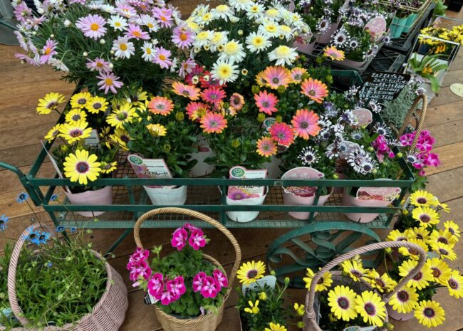 春らしいフラワーバスケットなど、色とりどりのお花を販売します。