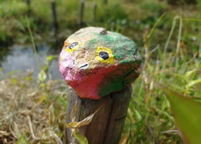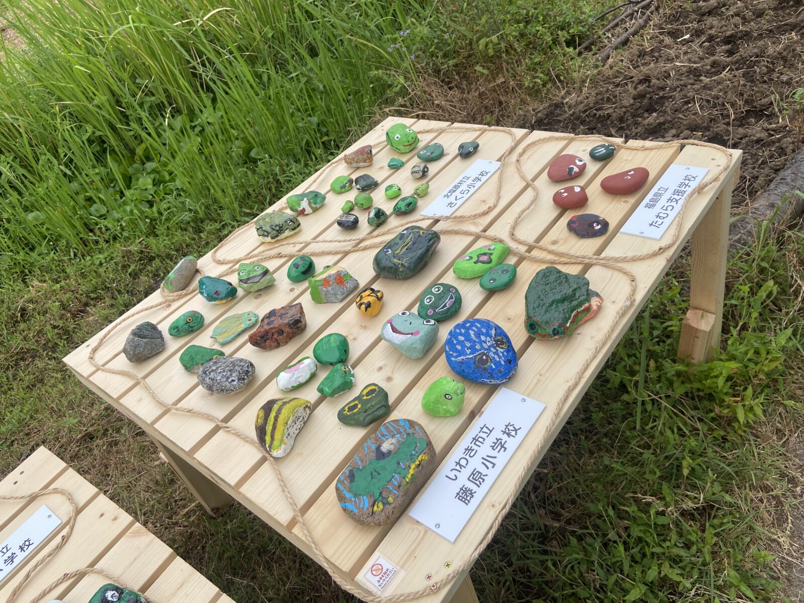 福島県内の子どもたちが、身近な自然素材の「石」からカエルの姿を想像して描きました。カエルの多様性を知り、それを支える里山の自然環境に興味を持つきっかけになればと思います。