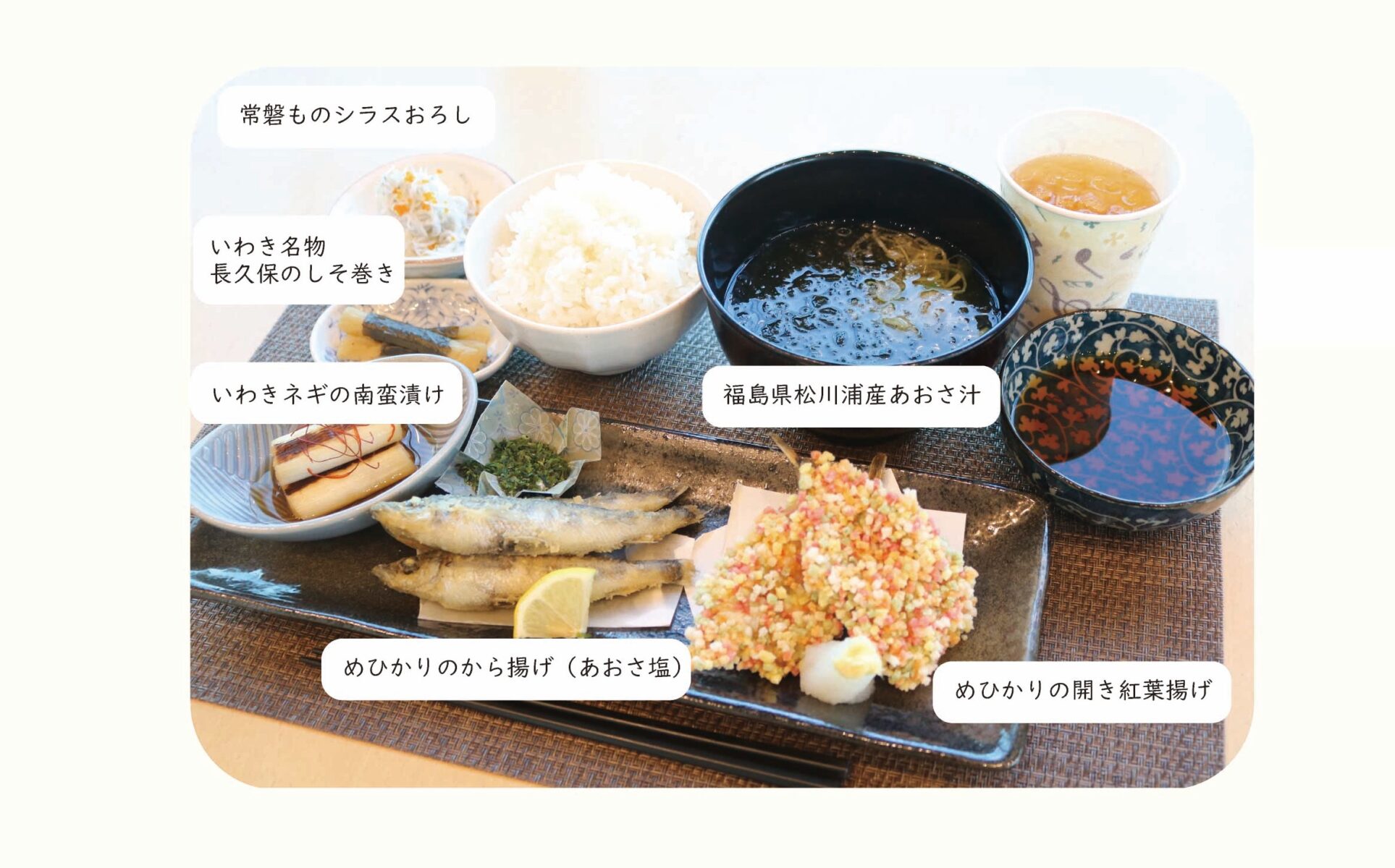 めひかりのから揚げ(あおさ塩)、めひかりの開き紅葉揚げ、いわきネギの南蛮漬け、常磐ものシラスおろし、福島県松川浦産あおさ汁、いわき名物 長久保のしそ巻き、ごはん、ドリンクバー
