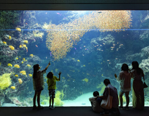 自然光が降り注ぐ館内では、植物も展示し、親潮の源流オホーツク海、黒潮の源流域熱帯アジアの自然、福島県の海山川の生態系を再現しています。釣りやバックヤードツアーなどの体験プログラム、裸足になって生き物とふれあえる屋外施設・蛇の目ビーチがあり、見るだけでなく様々な体験ができます。