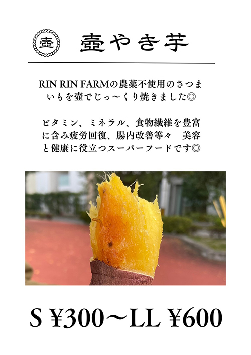 市内農園で甘薯(さつまいも)馬鈴薯(じゃがいも)を作っており、縄文ポテト(ジャーマン)、熟成壺焼き芋を販売!