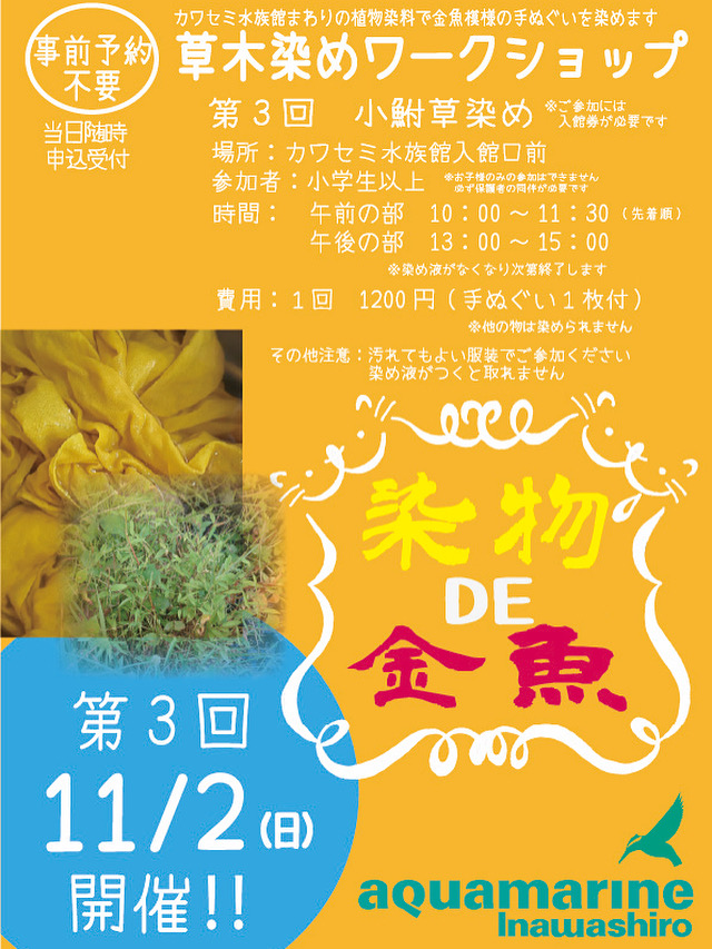 カワセミ水族館まわりの植物で金魚模様の手ぬぐいを染めます。