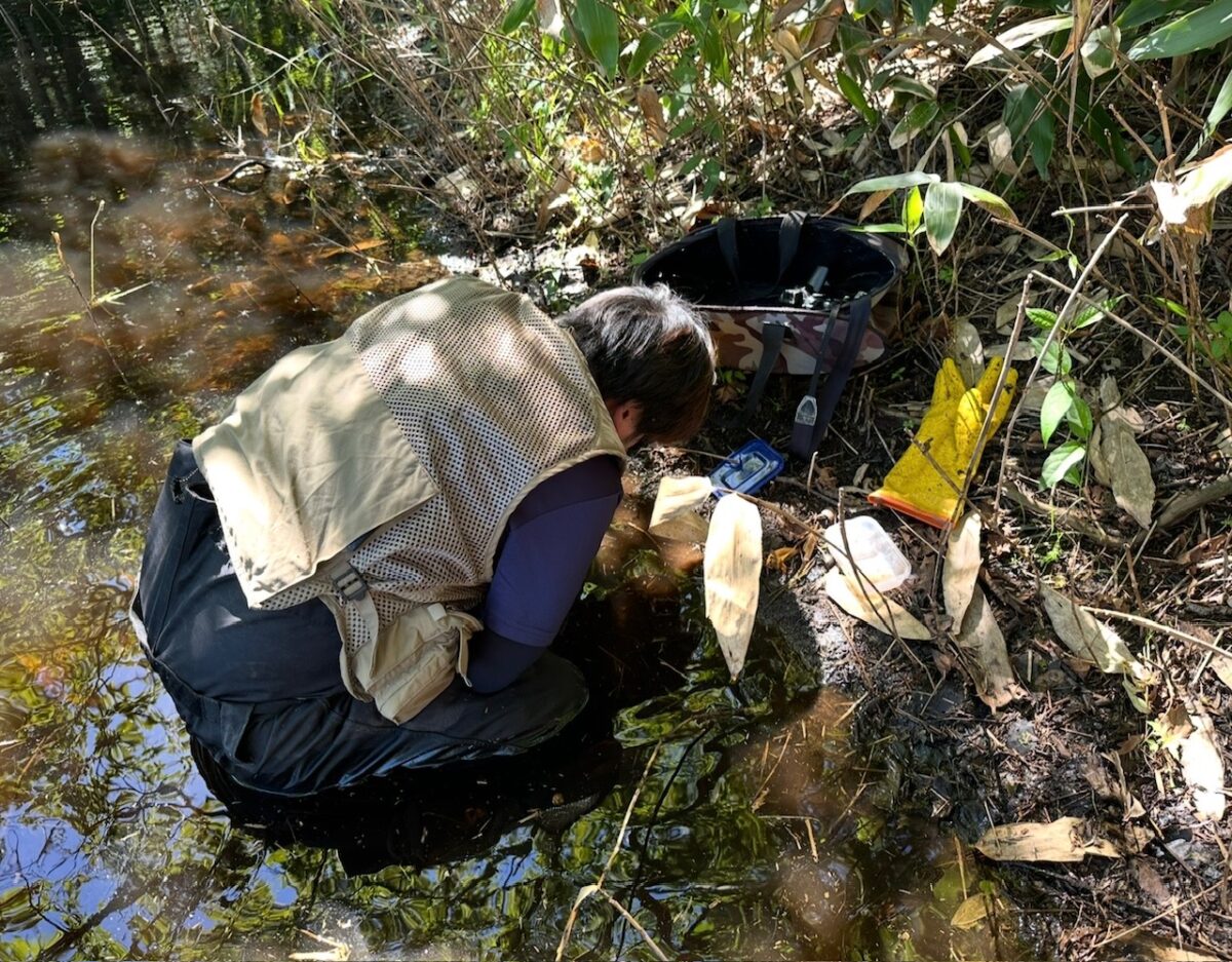 そのうちキタホソガムシは1977年に、ゲンゴロウの大家でもあった故佐藤正孝博士が北海道サロベツ地域で8個体採集されたもの以外記録がない状況で、幻の水生昆虫となっていました。そのため、当館職員をはじめとした研究グループで、サロベツ地域において2023年6月に特別保護地域以外で調査を行いましたが、発見することができませんでした。そのため、文献調査、標本調査をしたところ1993年にサロベツ地域で採集されたホソガムシの記録があったことがわかり、2023年8月に標本を所蔵していた松井英司さんから借用し調査したころ、キタホソガムシであることが判明しました。しかし詳しい採集地は不明であったため、2024年9月は特別保護地域内の許可を得て、調査を行ったところ、31年ぶりの再発見となりました。また生息地での個体数も安定していることがわかりました。