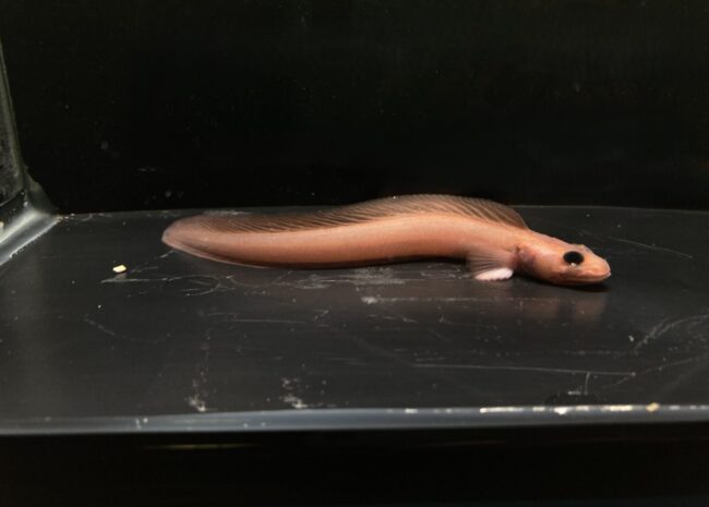 アクアマリンふくしま本館2階「親潮アイスボックス」コーナーにおいて、ダイダイヘビゲンゲの展示を開始しましたのでお知らせいたします。本種の展示は日本初です。生きている時にのみ見られる、ダイダイ色の体色が特徴の深海魚で、たいへん希少な展示です。