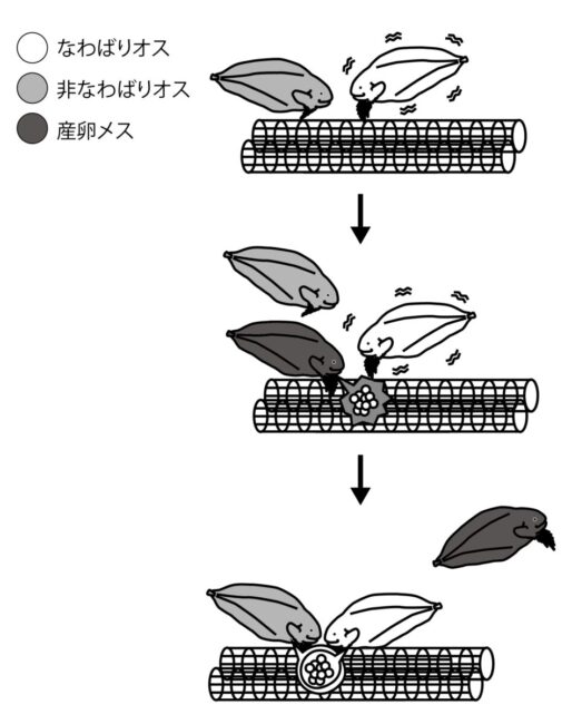- そしてメスの産卵の直後、なわばりオスの放精に割り込み、繁殖に参加する