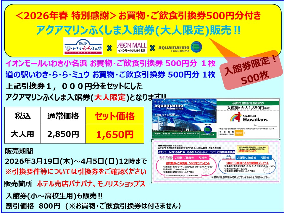 イオンモールいわき小名浜お買い物・ご飲食引換券と、道の駅いわき・ら・ら・ミュウお買物・ご飲食引換券をセットにしたアクアマリンふくしま入館券(大人限定)をスパリゾートハワイアンズの売店で販売します。