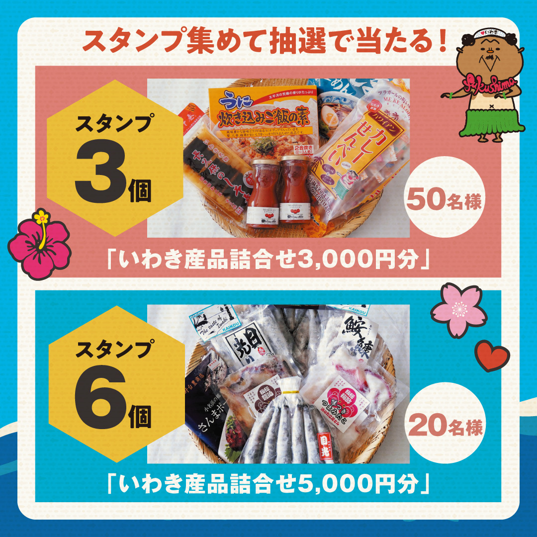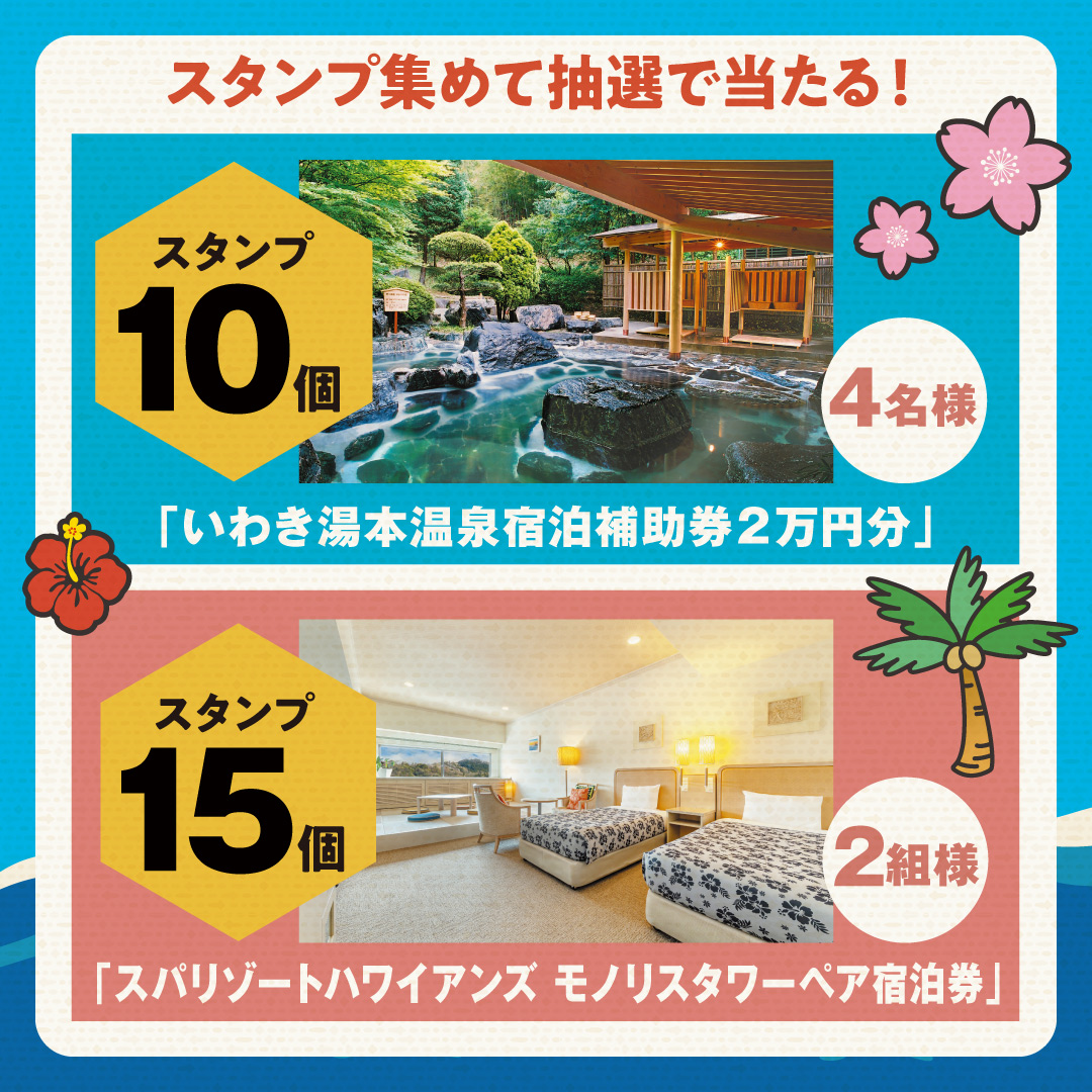 おでかけや食事、遊びを楽しみながら気軽に参加でき、集めたスタンプ数に応じて、いわきの特産品や宿泊券などが当たる抽選に応募できます。
