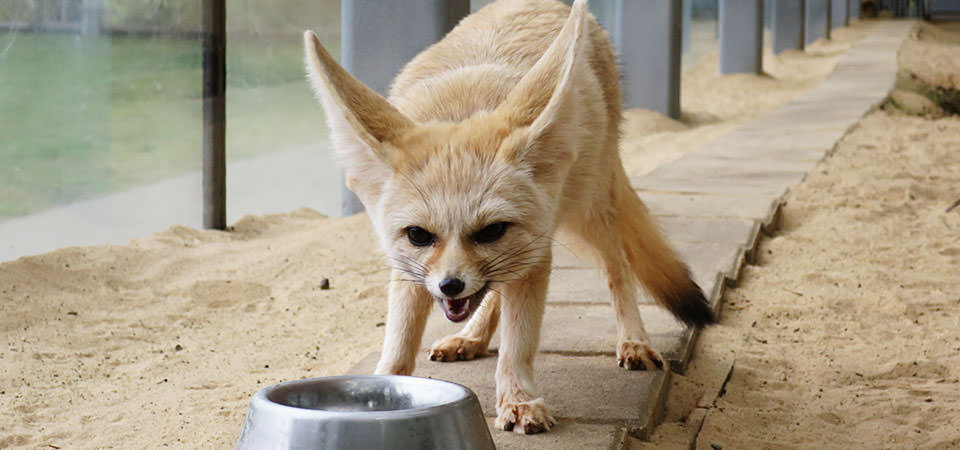 「カワウソのふち」コーナーで展示しているユーラシアカワウソは洞くつで寝ている時間が多いのですが、エサの時間はとても活発に動きます。水中を素早く泳ぐ様子もぜひご覧ください。