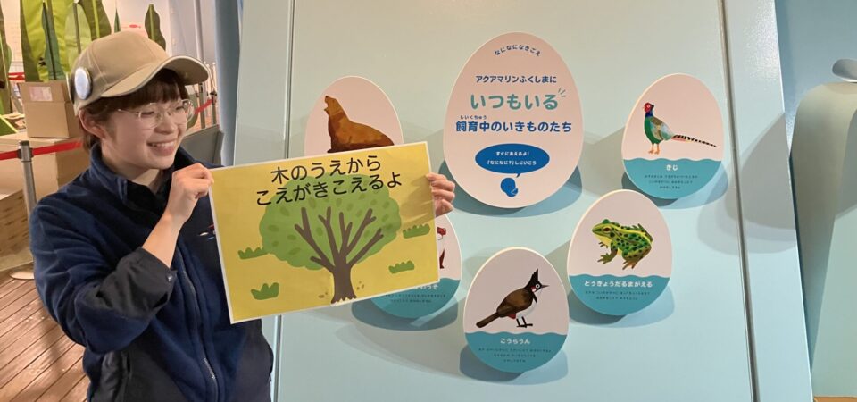 アクアマリンふくしまでは、いろんないきものの声をきくことができるよ。 どんな声でどんなふうになくのかな? ごんべえズといっしょに耳をすませて、いきものたちの声を探してみよう。
